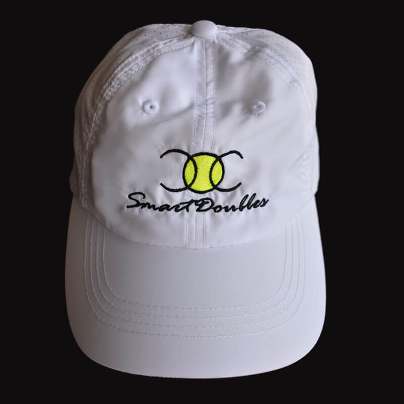 This embroidered super lightweight cap-perfect for tennis and other hot weather activities-has four perforated back panels for breathability and moisture-wicking performance. The material is 100% polyester with a Velcro fastener. One size fits all. Currently available in white and navy only.